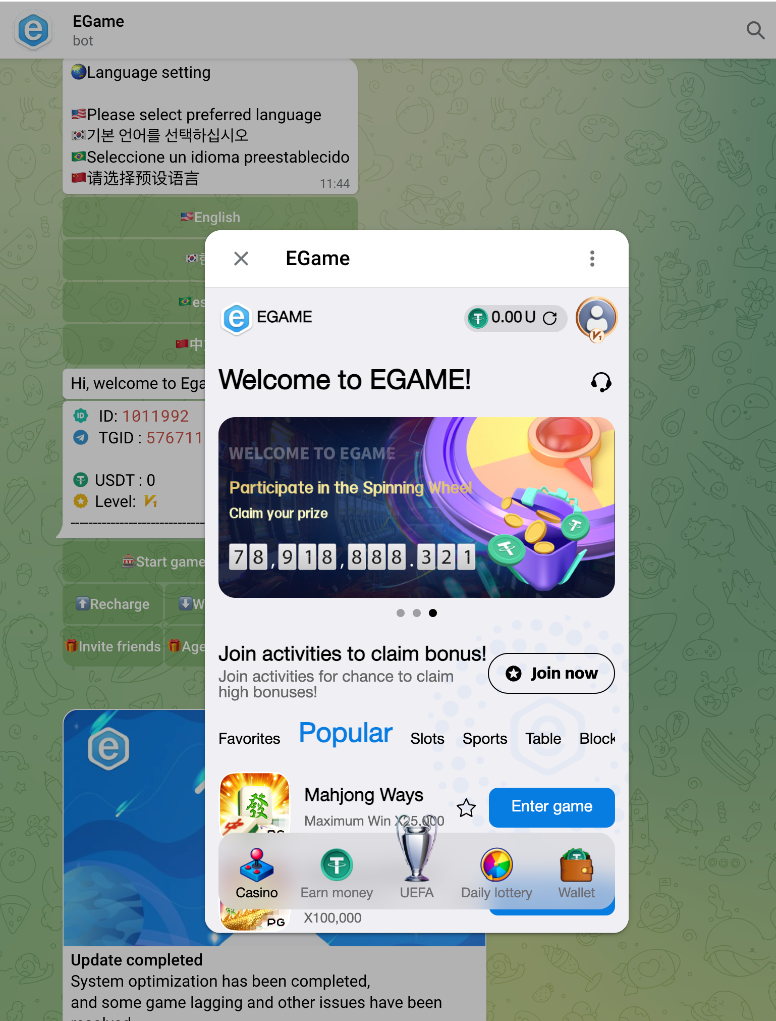 Welcome Bonus: EGame does not offer a generic welcome bonus like most TG Casinos, however you can earn cash through Refer a Friend and their Daily Lottery promotion.