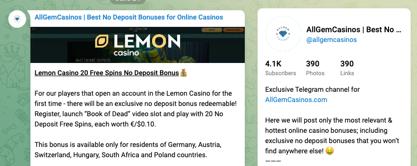 - Variety of Offers: The channel regularly updates with unique offers from different online casinos. These offers typically include free spins and free chips on popular slots and casino games, giving users a chance to experience gambling without financial risk.