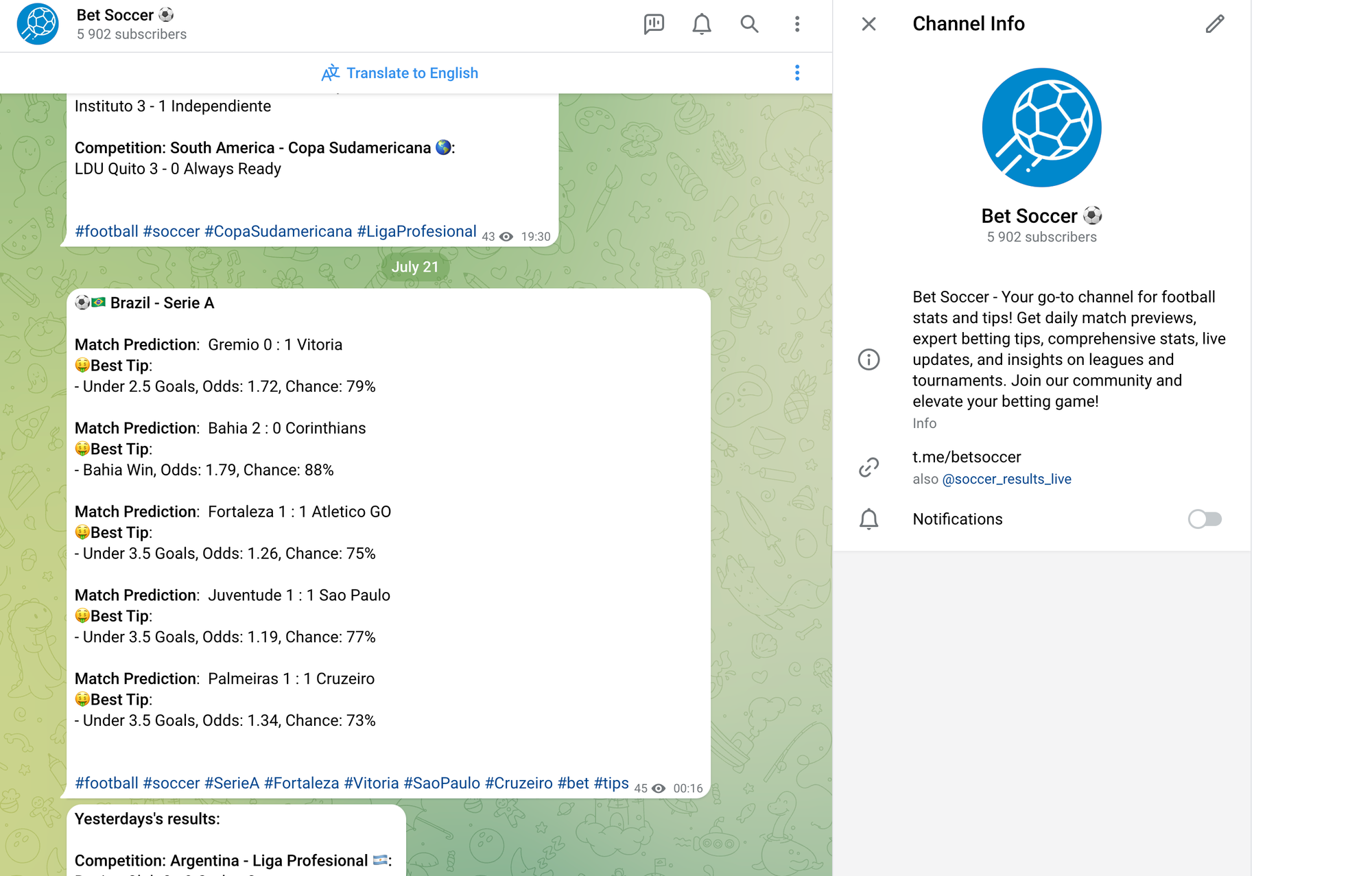 The Telegram channel "Bet Soccer ⚽️" is a hub for football enthusiasts, offering expert betting tips, detailed match previews, and comprehensive statistics. With over 5,900 subscribers, it provides daily insights into various leagues and tournaments, helping users make informed betting decisions. The channel's content includes live updates and expert analysis, making it a valuable resource for anyone looking to enhance their football betting strategies.