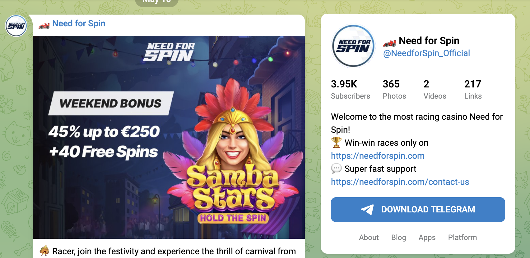 "Need for Spin" is primarily aimed at those interested in online gaming and casino promotions. The channel frequently posts updates about various bonuses, free spins, and special events tied to online slots and other casino games. It appeals to users who in interested mostly in promotional offers.