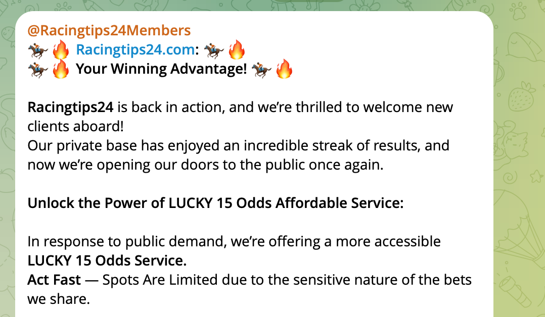 - Insider Information: Many posts claim to have insider information from stables, trainers, or trackside, which supposedly gives subscribers an edge.