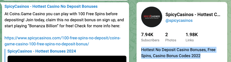 SpicyCasinos is dedicated to sharing information about no deposit casino bonuses and free spins offers from various online casinos. An active channel with frequent updates, catering to those interested in trying out new casinos or games without making initial deposits.