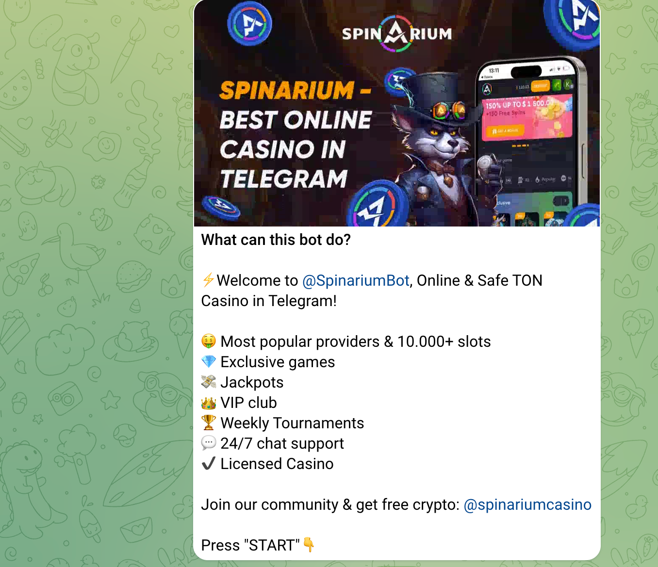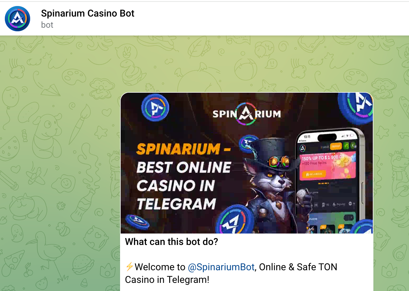 Spinarium Casino is an online casino available via Telegram, known for its extensive game library and user-friendly design. It offers a wide variety of games, including slots, table games, lotteries, and live casino options from over 80 top providers like Pragmatic Play Live and Evolution Gaming. Spinarium provides several bonus options, including a substantial welcome package, though the wagering requirements are relatively high. Licensed by the Curacao gaming authority, it ensures a secure and regulated gaming environment. Despite lacking a live chat support feature, it offers email support and a comprehensive FAQ section